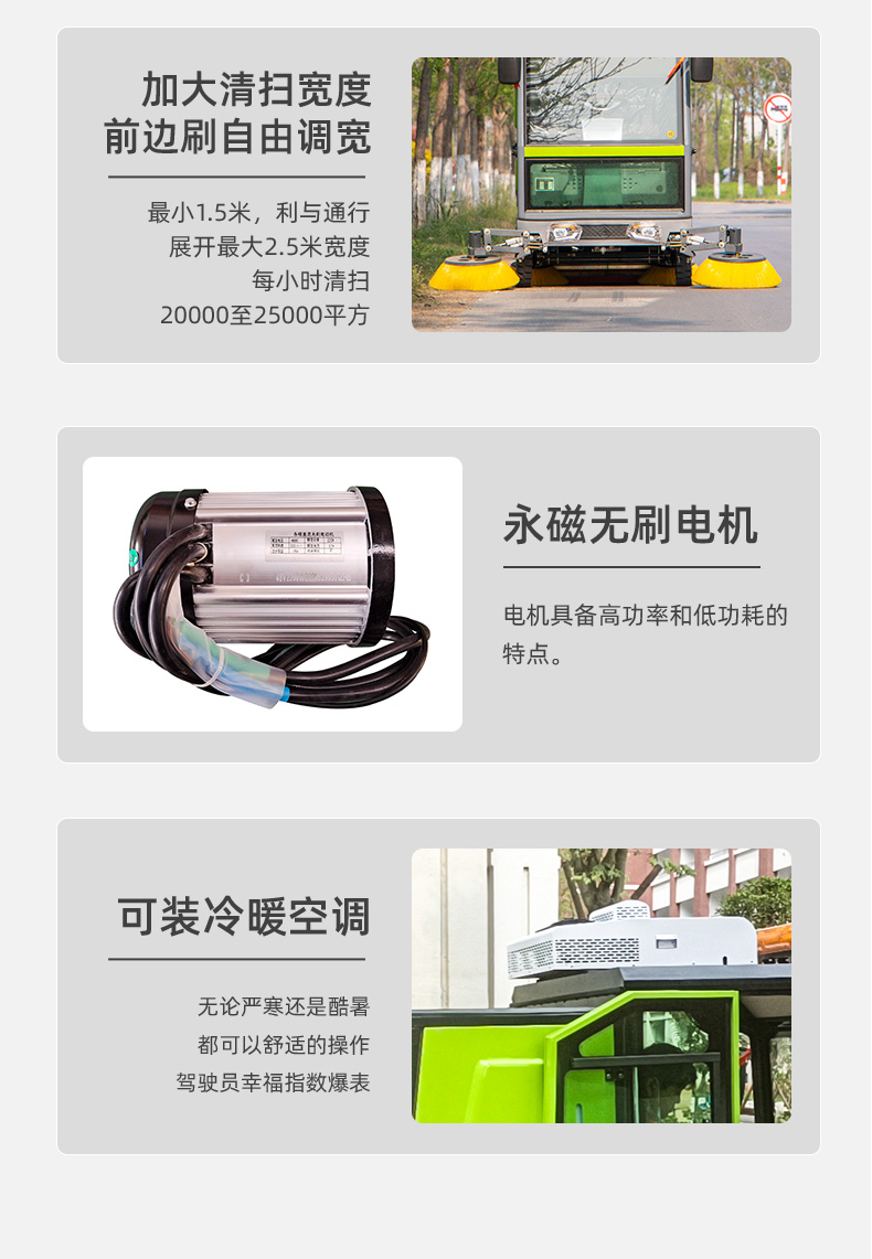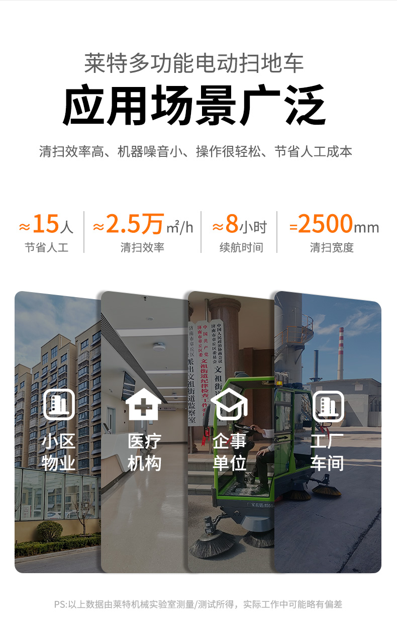 莱特LT-G50型全封闭四轮驾驶式扫地车,配备高压清洗和高压雾炮功能,清扫宽度2500mm,满电工作时间为6-8小时,工作效率25000㎡/h,采用的是8*200A免维护铅酸电池,高压雾炮射程可达10米以上,可对作业环境高效的降尘,还可以用于绿植养护和环境消杀。高压水枪可以对地面顽固污渍进行清洁,还可以冲洗路牙石,为绿植浇水,工作之余,还可以用高压水枪清洗车辆。应用场景为:厂区、车间、公园、街道、物业小区、码头、学校、机场、停车场、地下车库、充电站、加油站、公园工厂、工业园区等需要大面积清扫的区域区域。